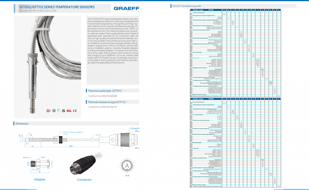 The GT7012/7112 series temperature sensors are suitable for temperature detection in extrusion equipment and tools/mechanical engineering. By using high-quality materials and our special manufacturing processes, these sensors can be used at a maximum temperature of +450 degrees Celsius. In the standard version, the measuring sleeve and connecting cable are made of high-quality stainless steel instead of galvanized steel. Especially for connection cables, we only use high-quality and carefully selected thermal materials, which can ensure better measurement accuracy even after use. In addition to various measurement sleeve designs with diameters ranging from 4.76mm to 10.00mm, we also offer a variety of installation options, including threaded adapters or without threaded adapters. To improve the torsion protection of the cable, there is always a torsion protection spring with a length of up to 10,000mm. Of course, stainless steel cables with polytetrafluoroethylene (PTFE) sheaths are also increasingly being used, as the effectiveness of the torsion protection and moisture-proof design reflects the applicability of these sensors.