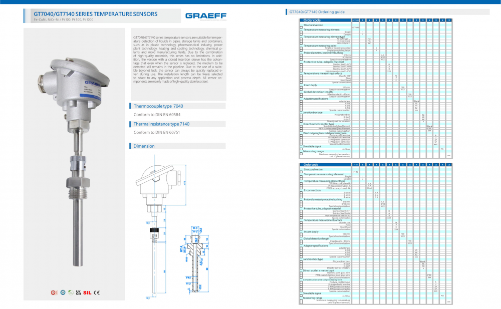 The GT7040/7140 series temperature sensors are suitable for temperature detection of liquids in pipelines, storage tanks and containers, such as in plastic technology, pharmaceutical industry, power plant technology, heating and cooling technology, chemical plants and mold manufacturing fields. Due to the combination of high-quality materials, this series has no restrictions. In addition, the version with a closed insertion sleeve has the advantage that even if the sensor is replaced, the medium to be detected remains in the pipeline. Thanks to the adoption of the appropriate bayonet lock, the sensor can always be quickly replaced even during use. The installation length can be freely selected, thus adapting to any application and process depth. All sensor components are mainly made of high-quality stainless steel.