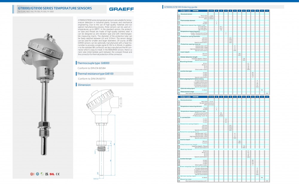 GT8000/GT8100 series temperature sensors are suitable for temperature detection in industrial plants, furnaces and mechanical engineering. Due to the use of high-quality materials and our special manufacturing process, these sensors can be used at temperatures up to 600°C. In the standard version, the protective tube and thread are made of high-quality stainless steel. It can be designed as anti-vibration type and with interchangeable measuring inserts. The diameter of the protective tube can be freely selected between 6.0 and 12.0mm. The sensor design can be used for smaller and larger diameters. Of course, all GT8000/8100 sensors can be optionally manufactured with a head transmitter to provide a single signal (0-10V to 4-20mA). In addition to the standard BKY connector, we also manufacture the K connector which is easy to install. In the 8000/8100 version, there is a neck tube (intermediate part) between the screwed thread and the connector for thermal protection of the connector.