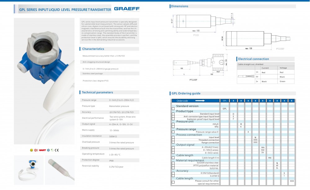 GPL series input level pressure transmitter is specially designed for submersible level measurement. The sensor adopts diffused silicon core, digital circuit board with strong anti-RF and electromagnetic interference built into the transmitter, and has the cha-racteristics of strong antijamming ability and wide temperature compensation range. The standard body of the transmitter is made of stainless steel, the assembly process is perfect, and the protection level is IP65, which ensures the durability and long