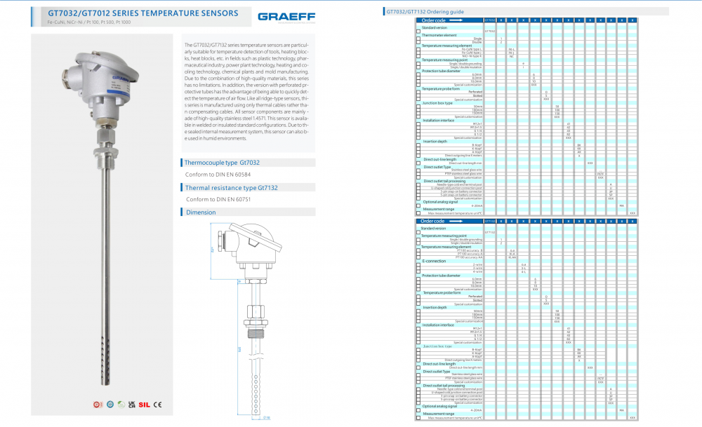 The GT7032/GT7132 series temperature sensors are particularly suitable for temperature detection of tools, heating blocks, heat blocks, etc. in fields such as plastic technology, pharmaceutical industry, power plant technology, heating and cooling technology, chemical plants and mold manufacturing.